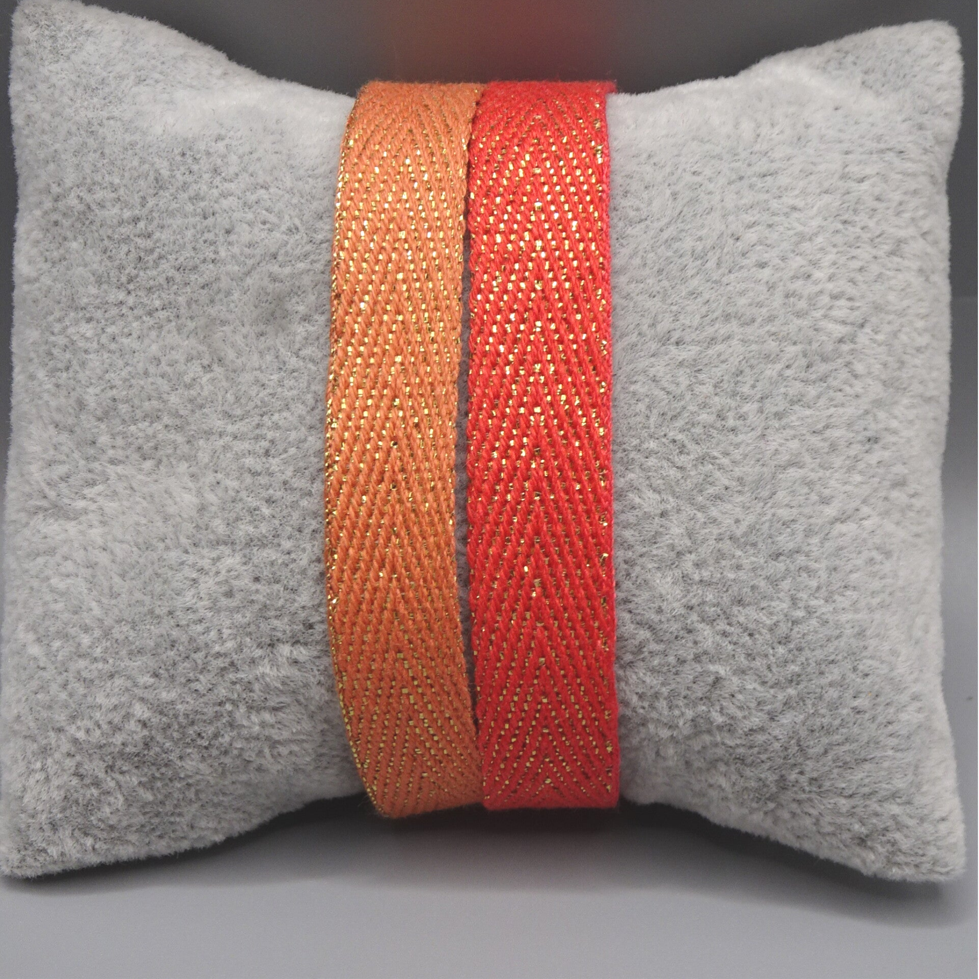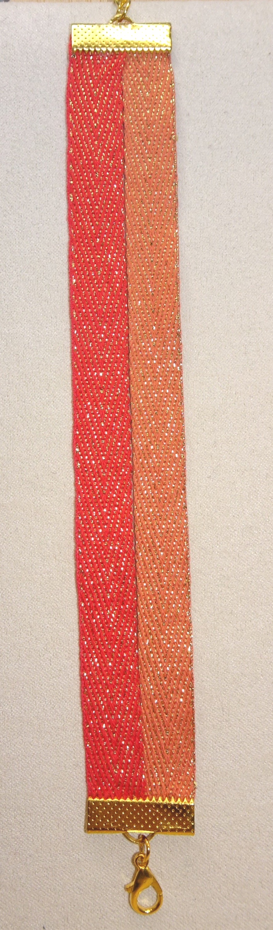 Bracelet 2 rangs de tissu pailleté, la première orange et la seconde rouge.