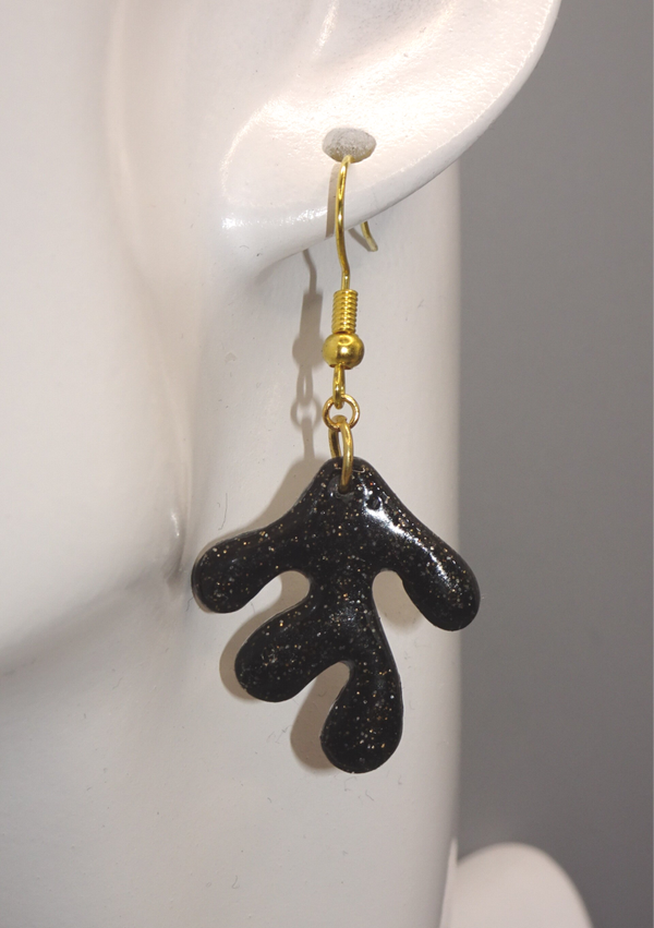 Boucles d'oreilles en forme d'algues, en pâte polymère paillettée, de couleur noire.