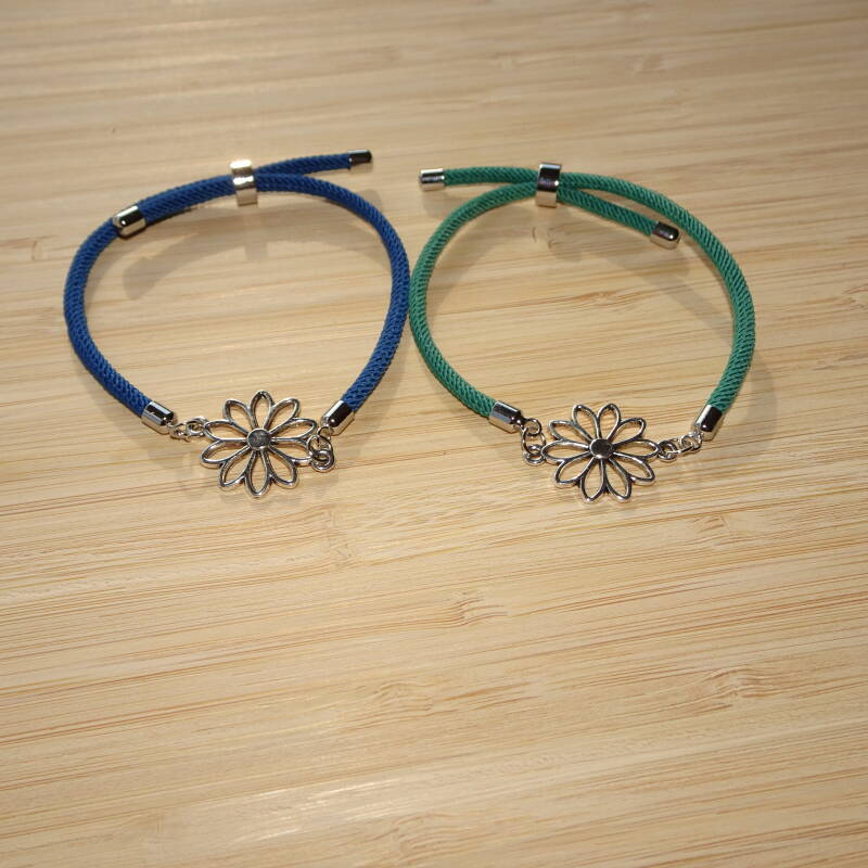 Bracelet avec un cordon réglable en coton et acrylique vert.