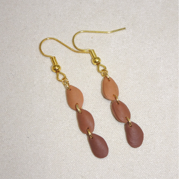 Ces boucles d’oreilles en pâte polymère sont inspirées d’une moule ramassée sur une plage.