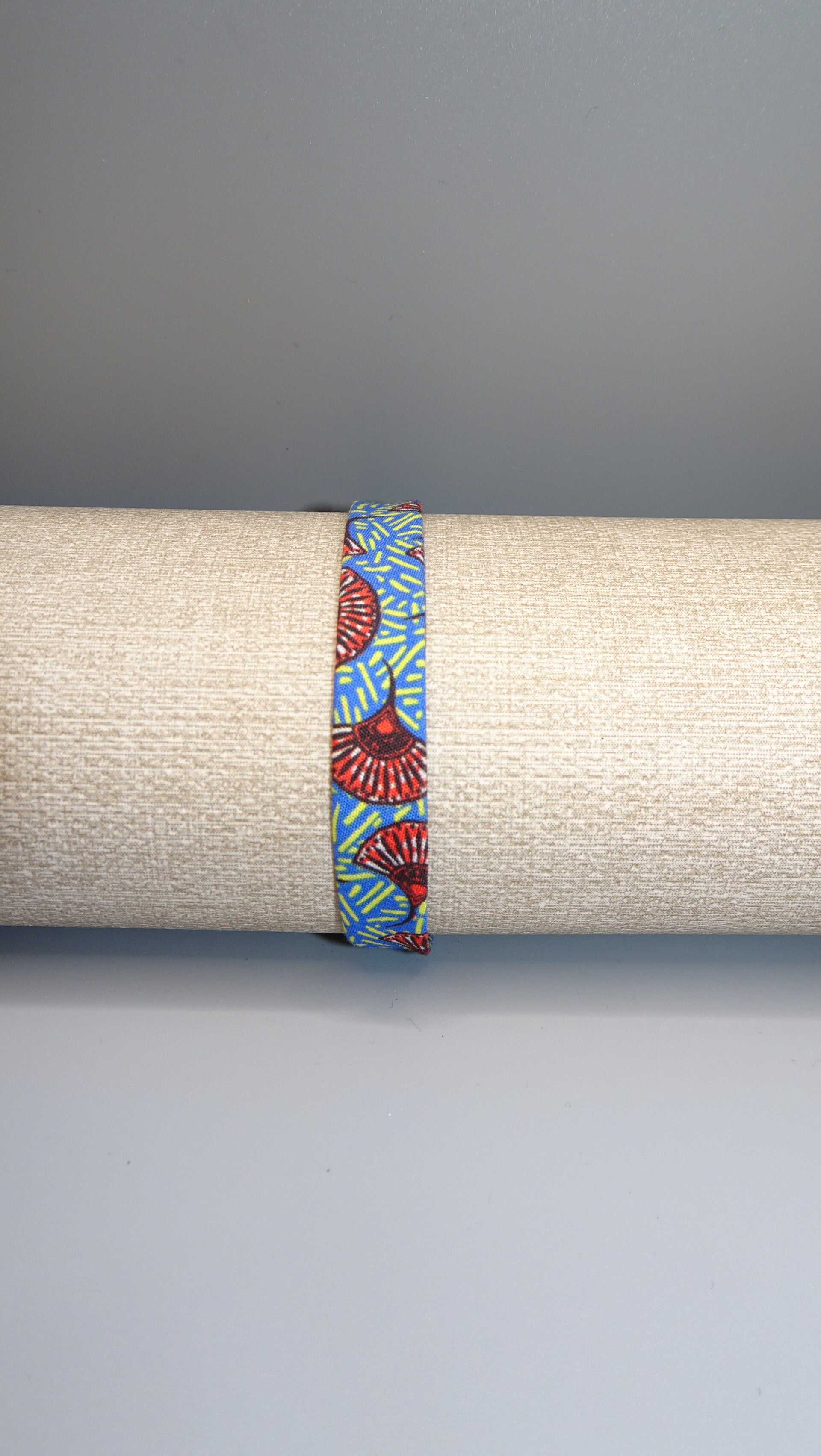 Bracelet en tissu wax, à motifs géométriques et couleurs vives.