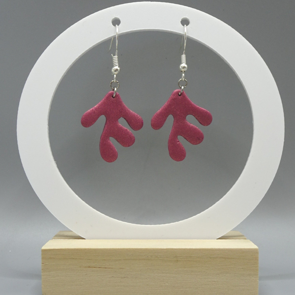 Boucles d'oreilles en forme d'algues, en pâte polymère paillettée rose foncé