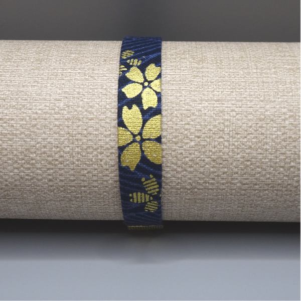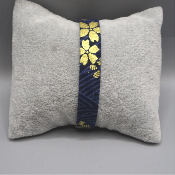 Bracelet en tissu bleu marine qui arbore un motif de fleurs.