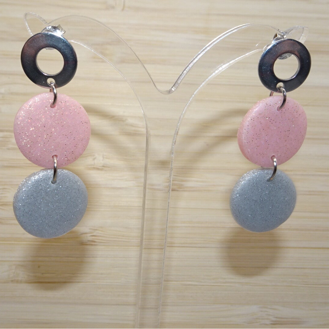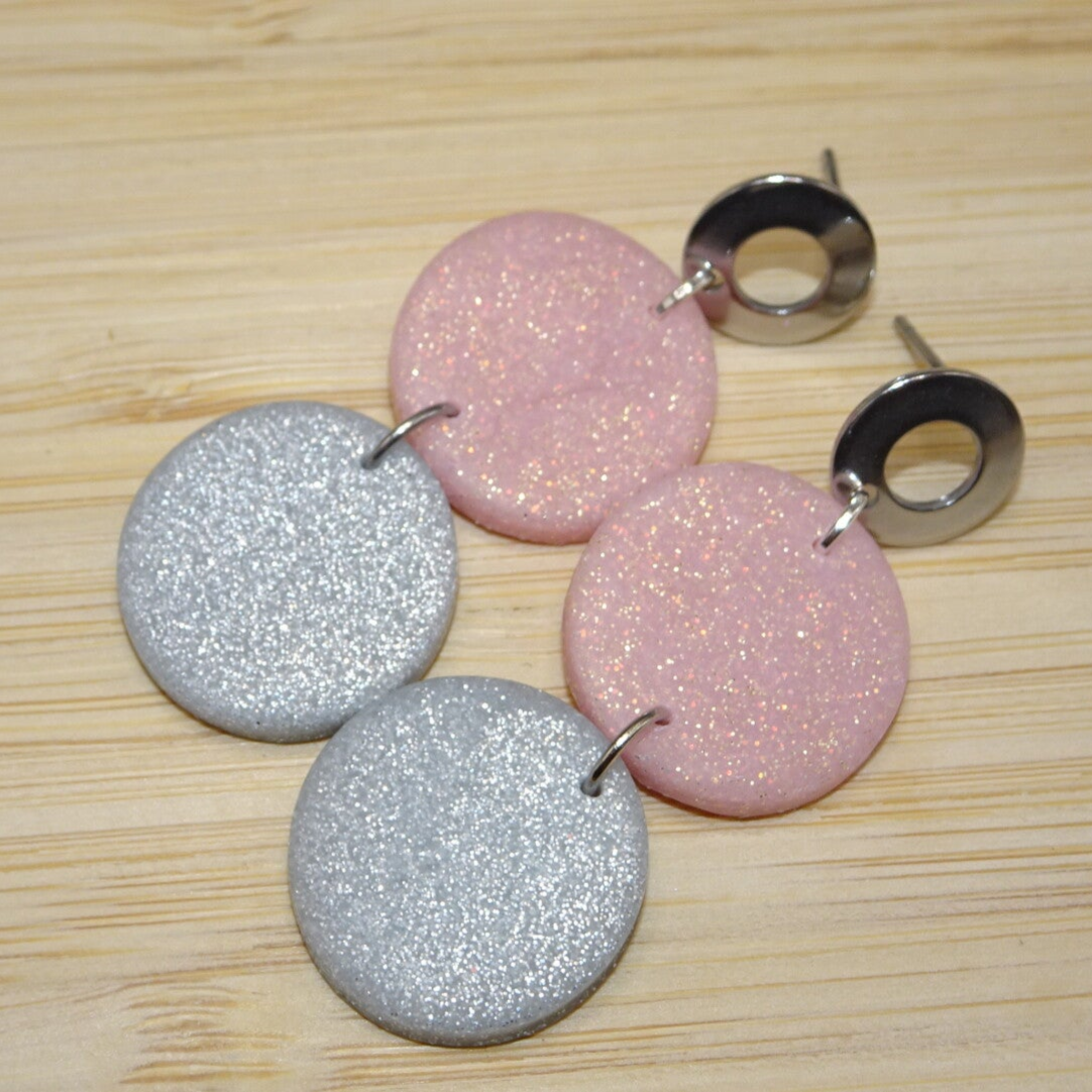 Boucles d'oreilles rondes, en pâte polymère pailletée.