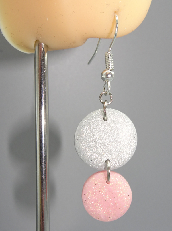 Le premier rond, plus gros est gris pailleté, le second en bas, le plus petit est d'une couleur rose pailletée.