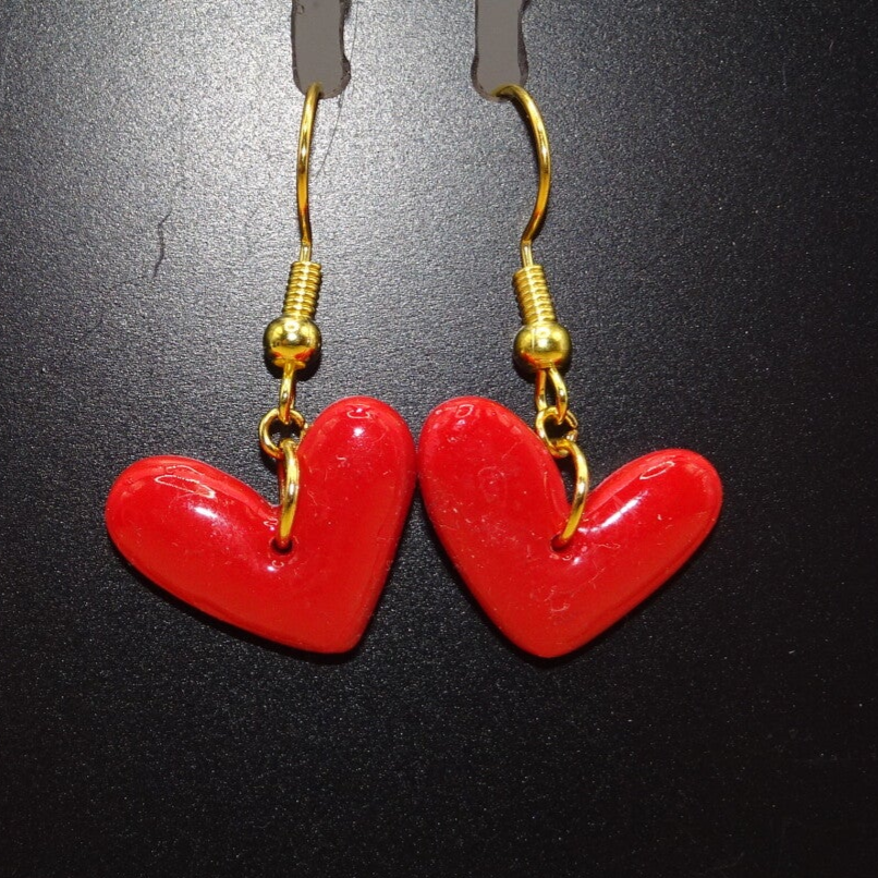 Boucles d'oreilles pendantes avec un coeur de couleur rouge, décoré de feuilles blanches.