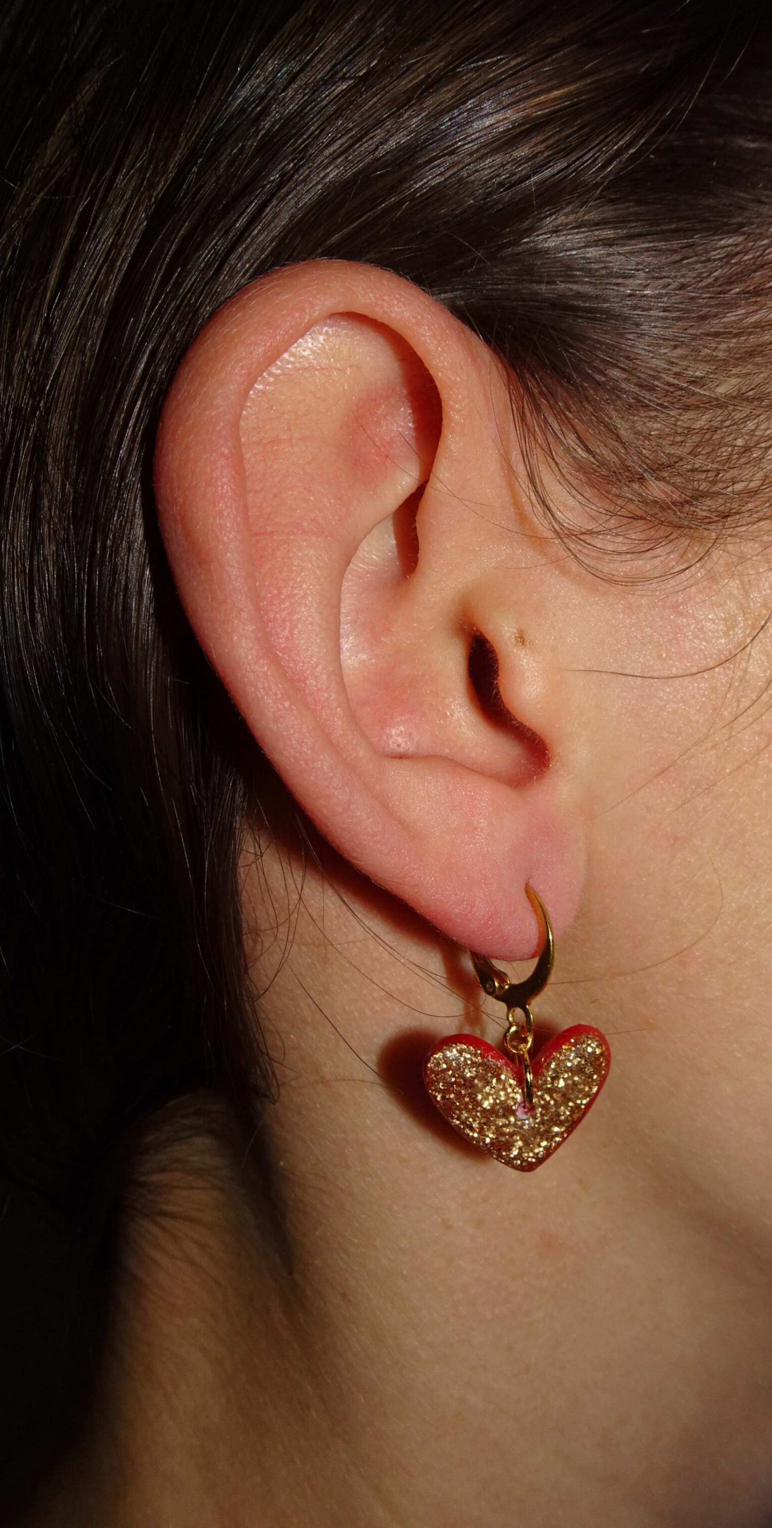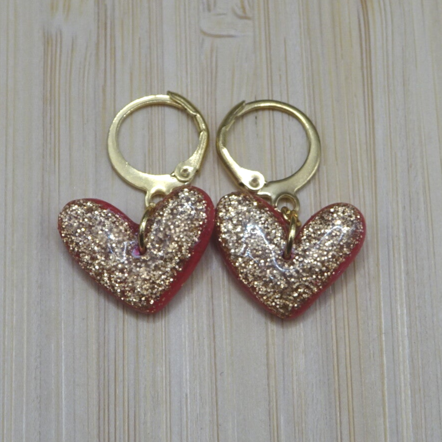 Boucles d'oreilles avec des coeurs de couleur rouge ornés de pailletes.