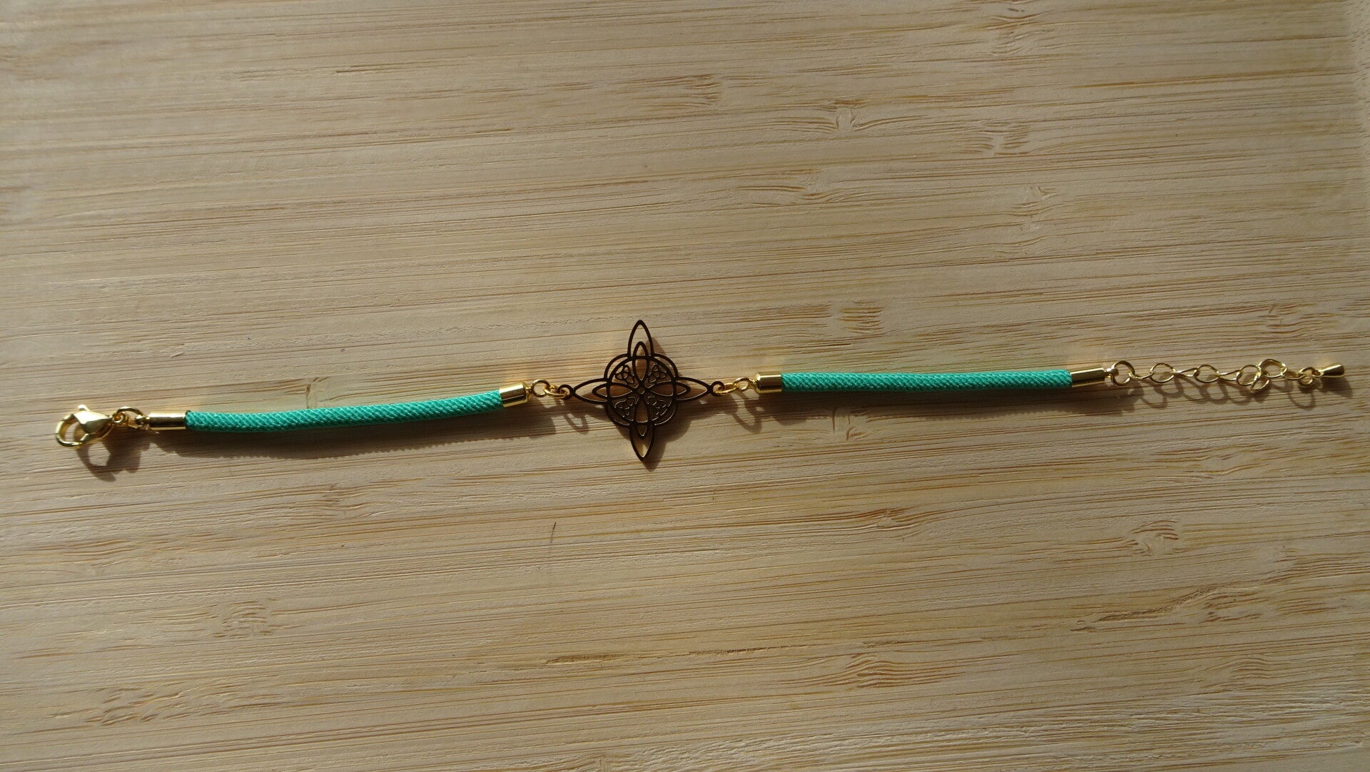 Bracelet avec un cordon réglable en coton et acrylique vert.