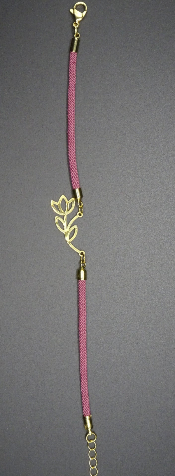 Bracelet avec un cordon réglable en coton et rose foncé.