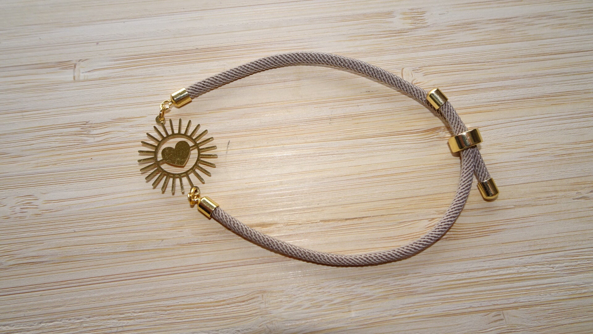 Bracelet avec un cordon réglable en coton et acrylique marron clair.