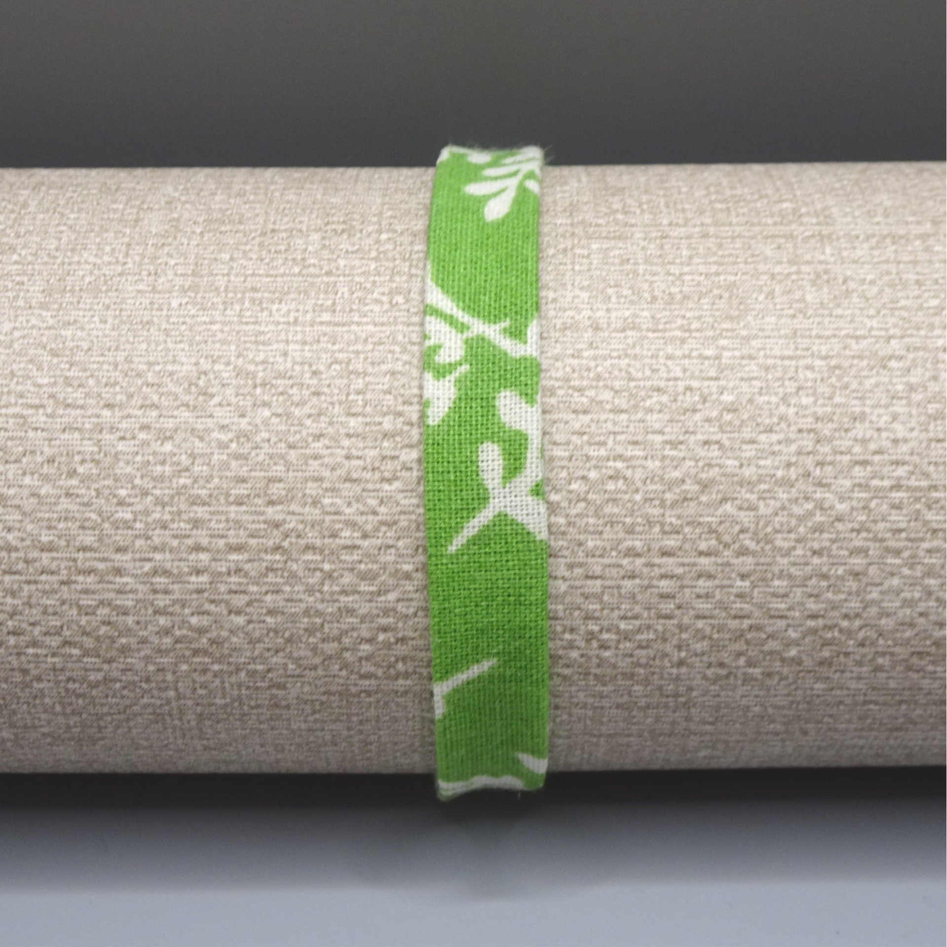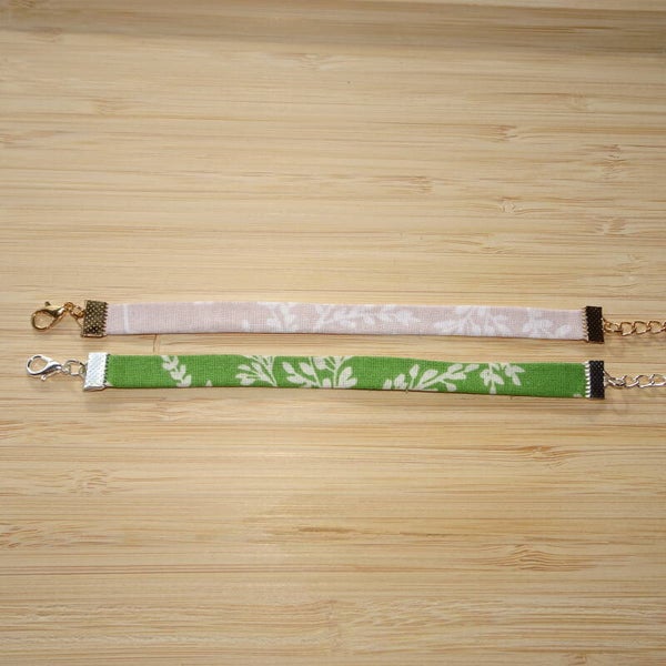 Bracelet en tissu vert qui arbore un motif de feuilles.