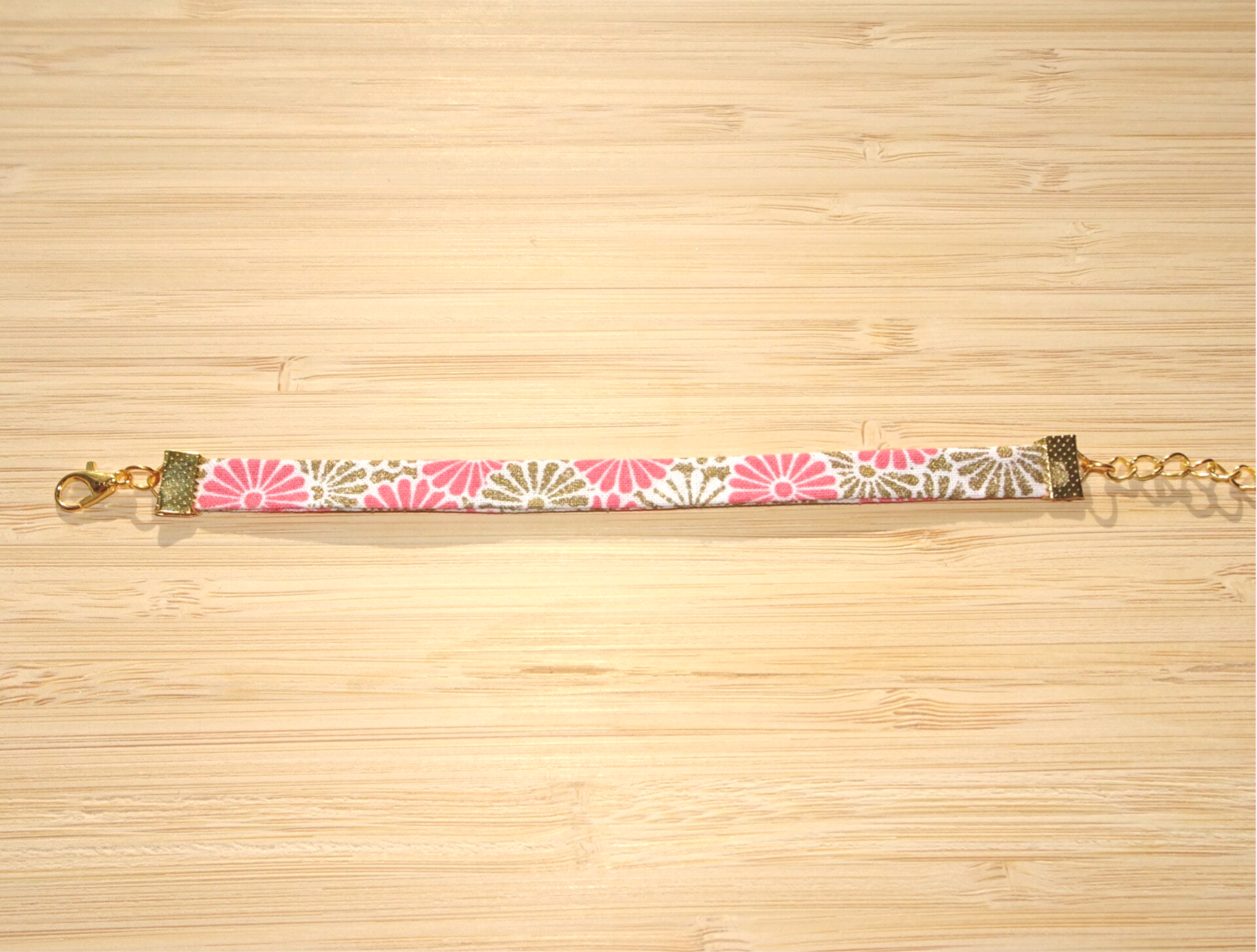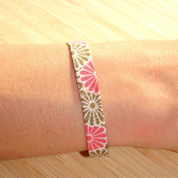Bracelet en tissu qui arbore un motif de fleurs roses et dorées.