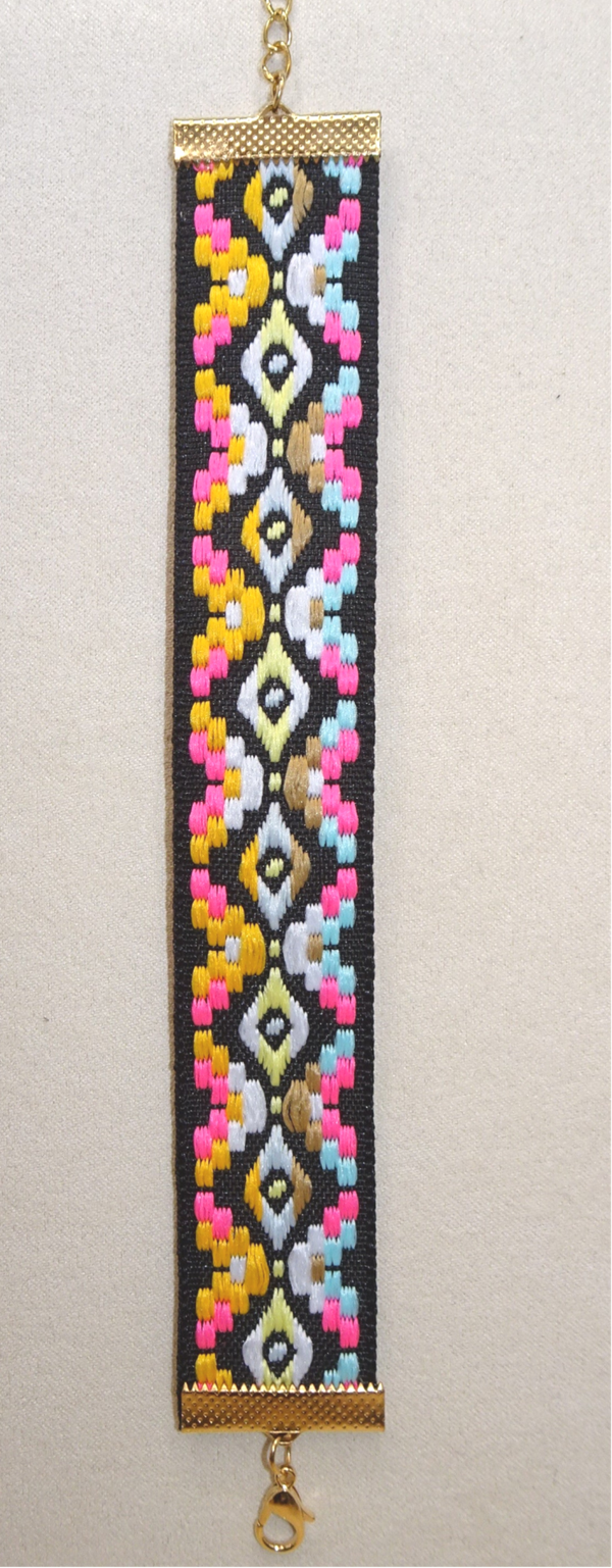 Bracelet en tissu multicolore avec un motif de brodé.