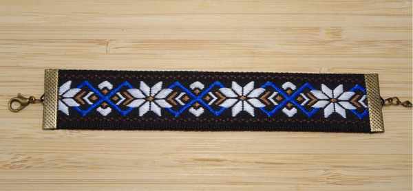 Bracelet en tissu bleu et marron et blanc avec un motif brodé.