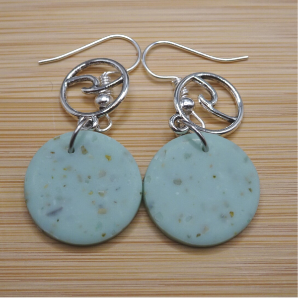 Le rond, la base de la boucle d'oreille est de couleur verte. Un pendant avec un motif de vague est superposé devant.