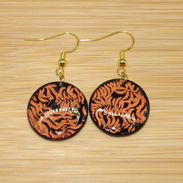 La couleur de fond est noire avec des dessins de couleur cuivrée.