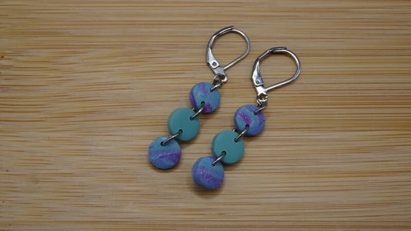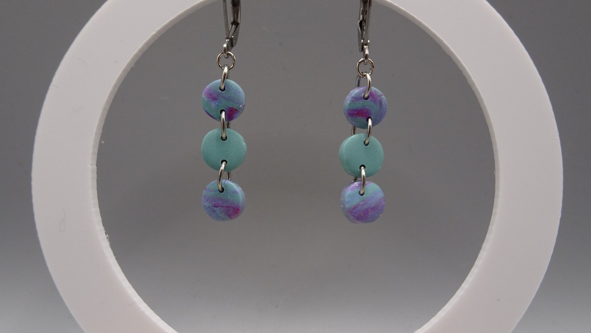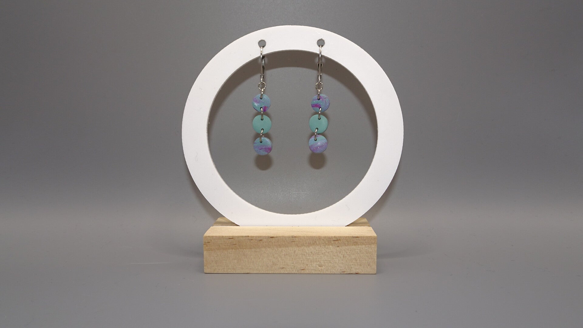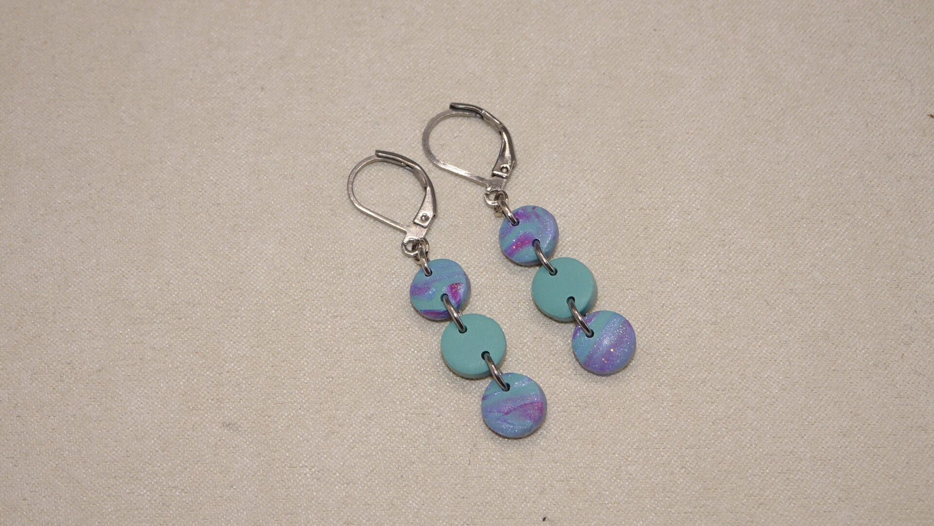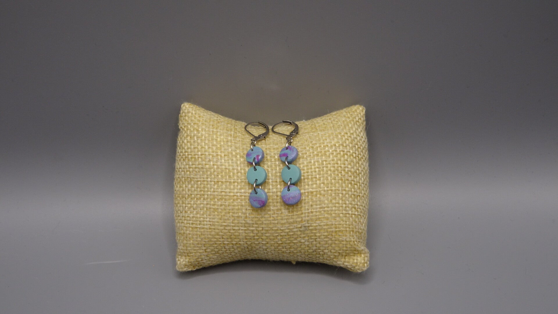Le premier et le dernier rond sont de couleurs marbrée verte, bleue et rose. Celui du milieu est de couleur verte