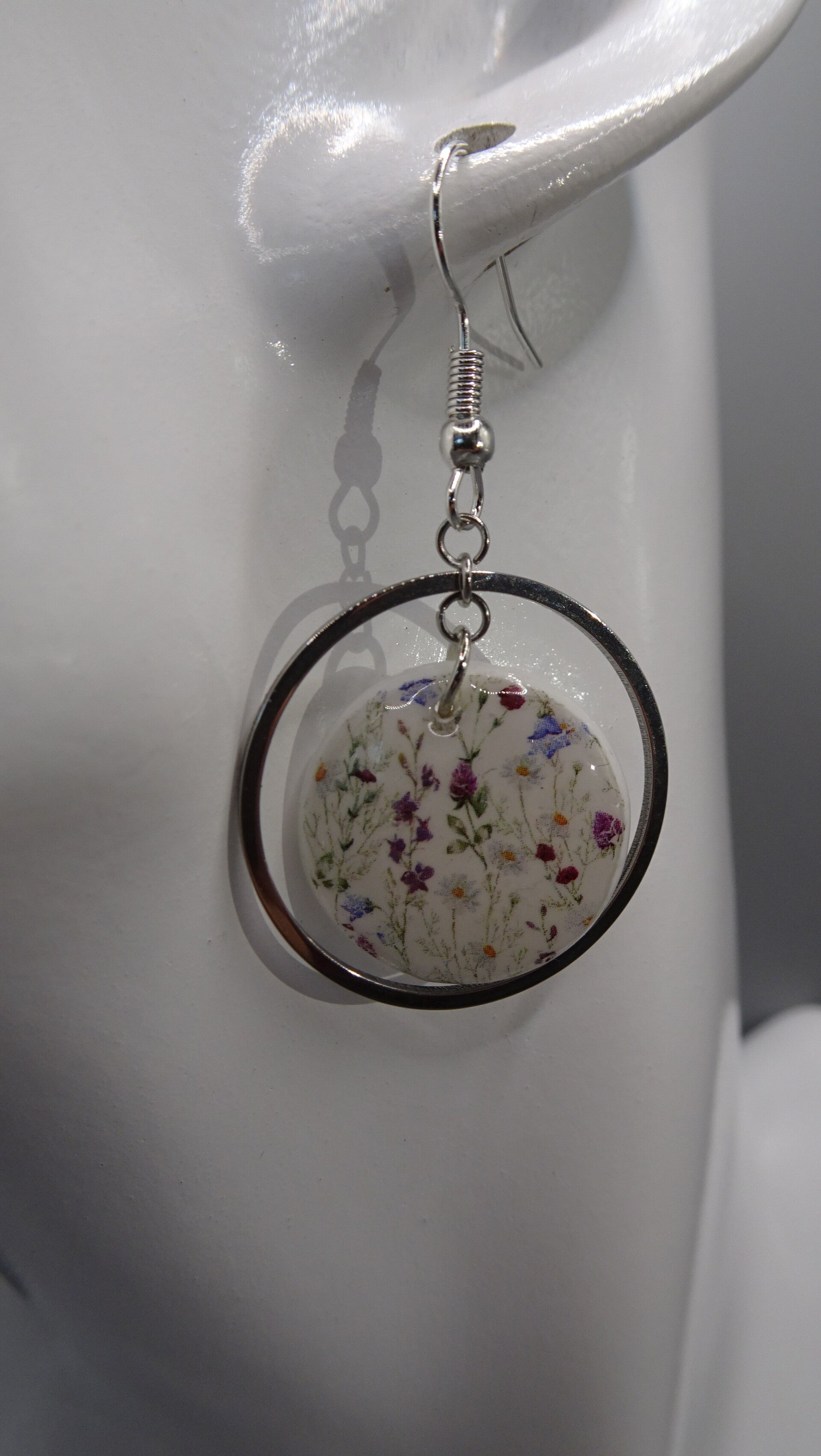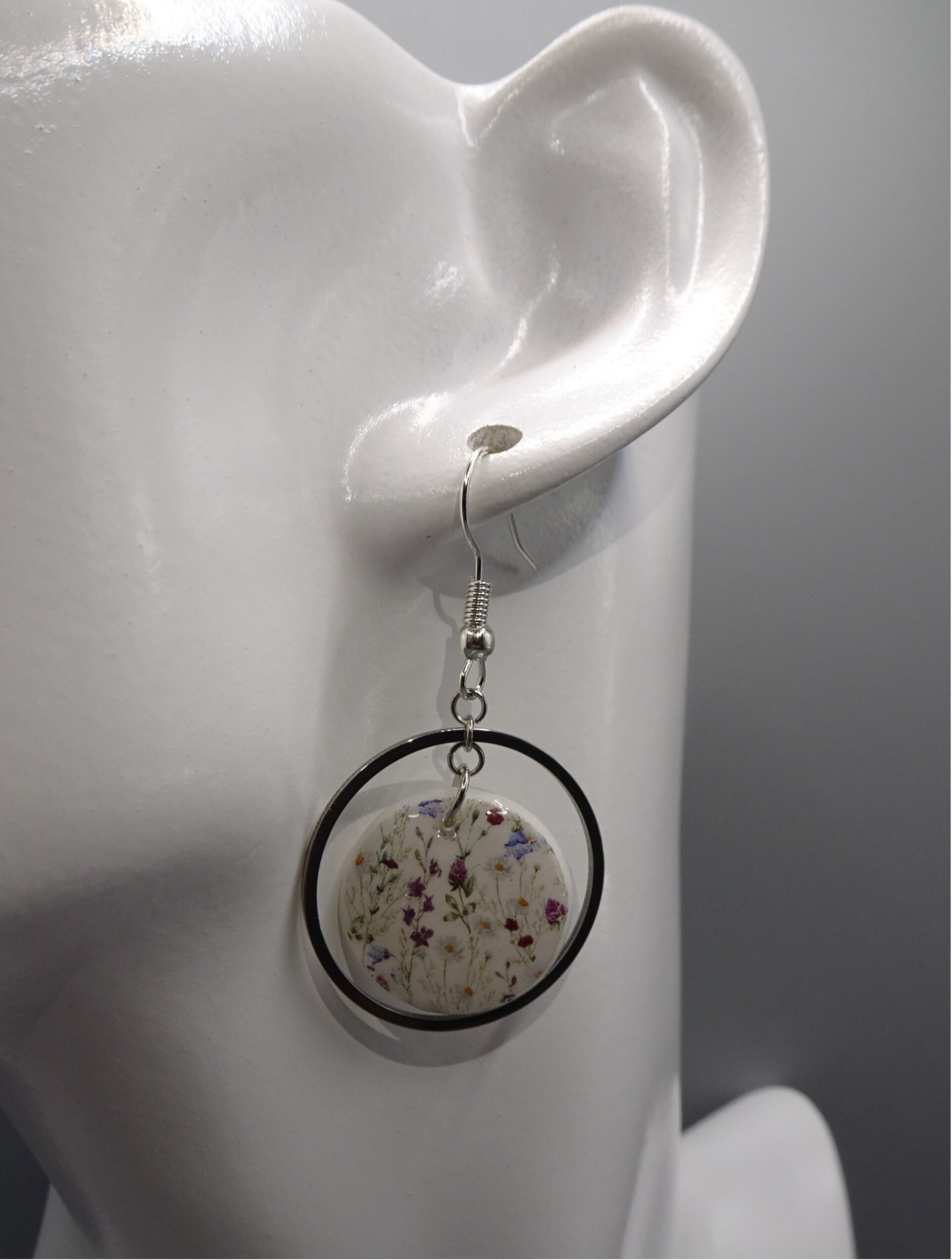 La base de la boucle d'oreille est blanche sur laquelle est superposé un motif liberty.