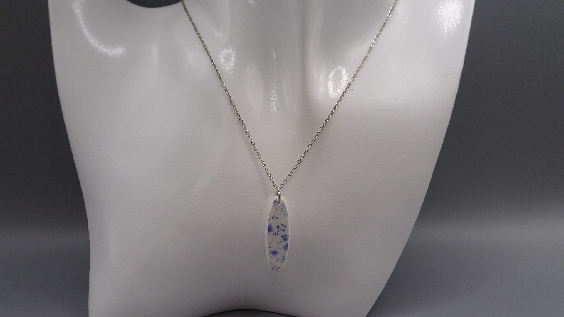 La base du pendentif est blanche sur laquelle est superposé un motif liberty.