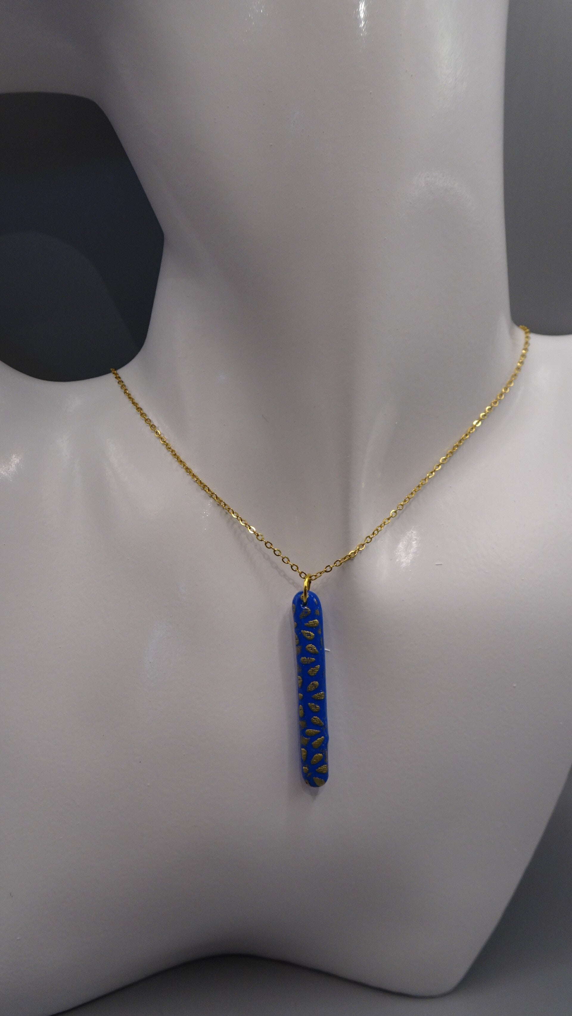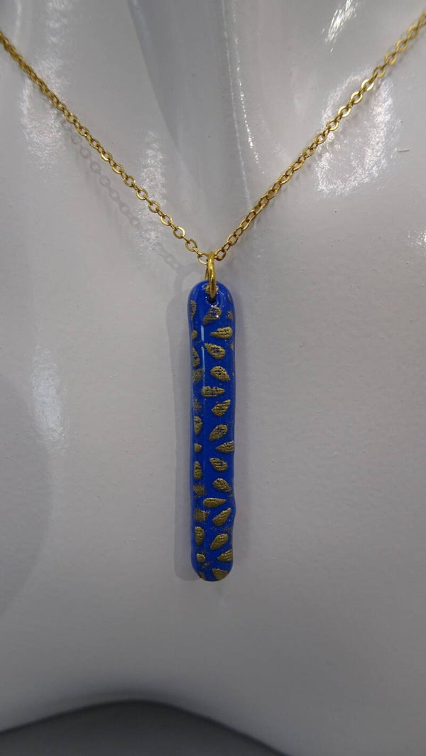La base du pendentif est bleue sur laquelle est superposée un motif de fleurs dorées.