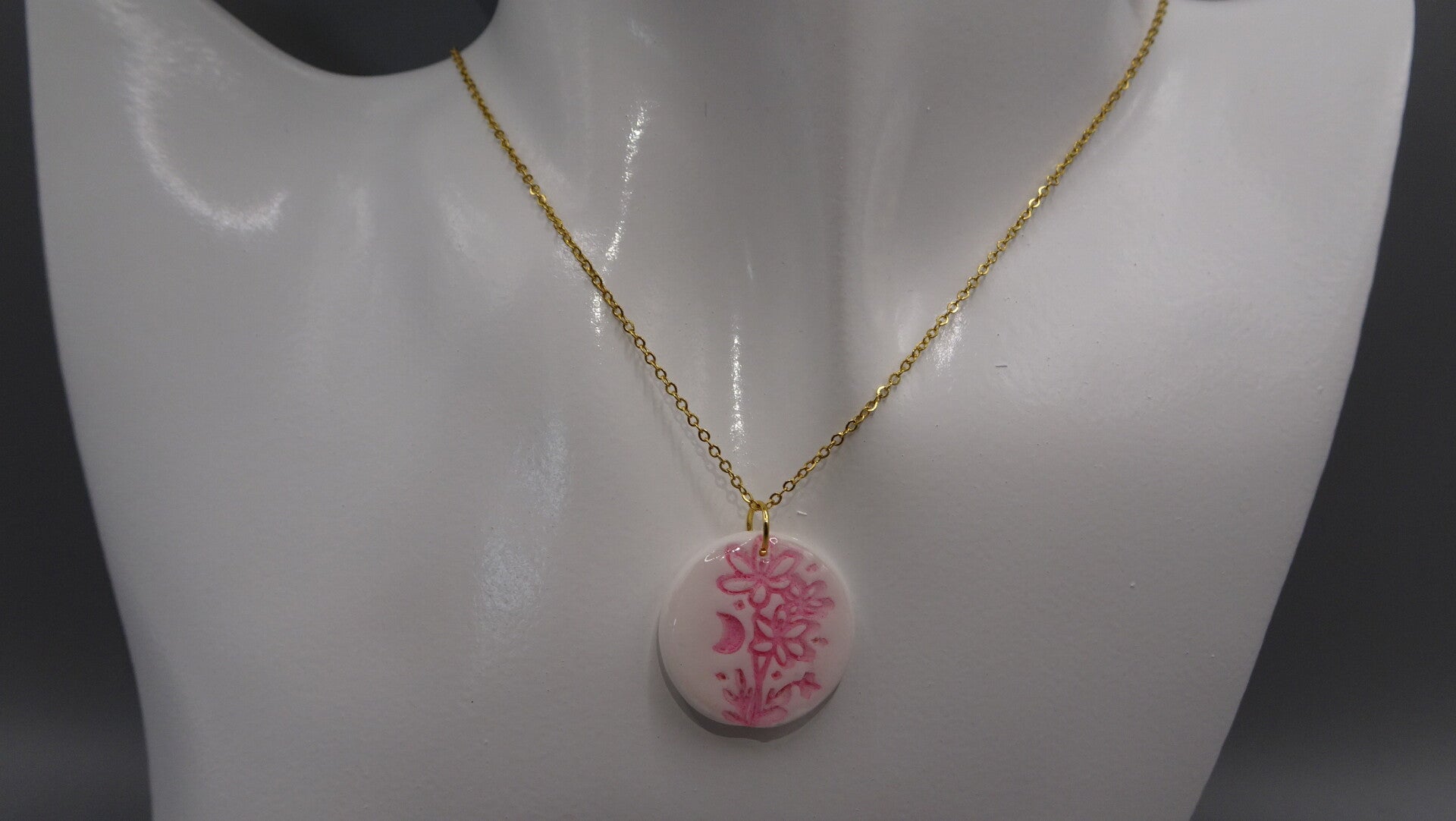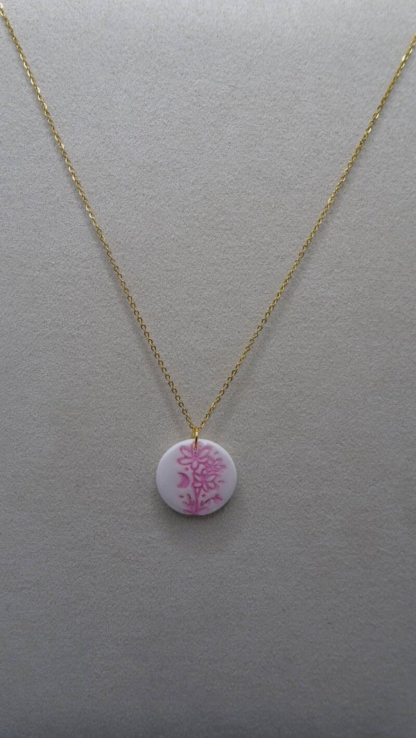 Le pendentif du collier est blanc avec un dessin de fleurs et d'étoiles.