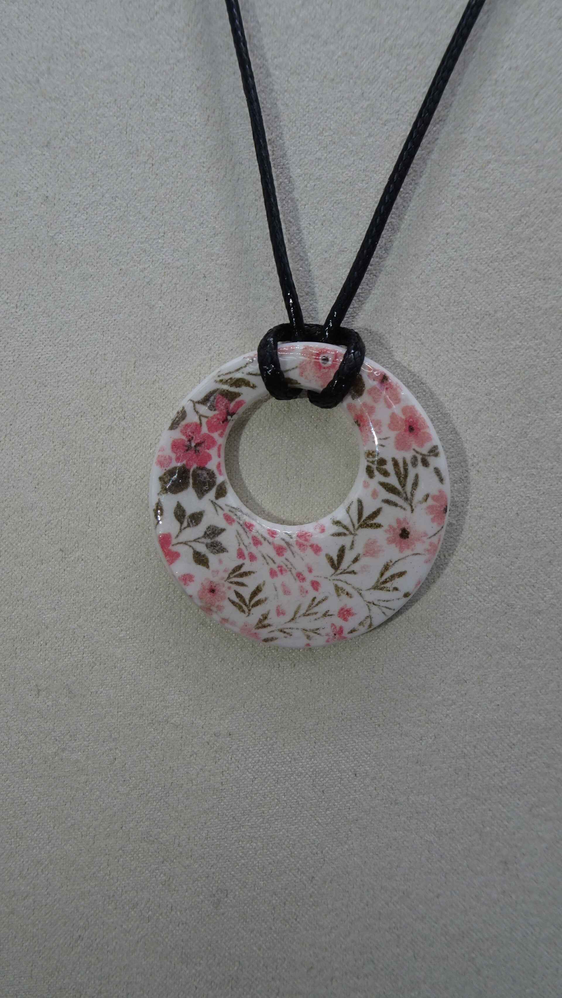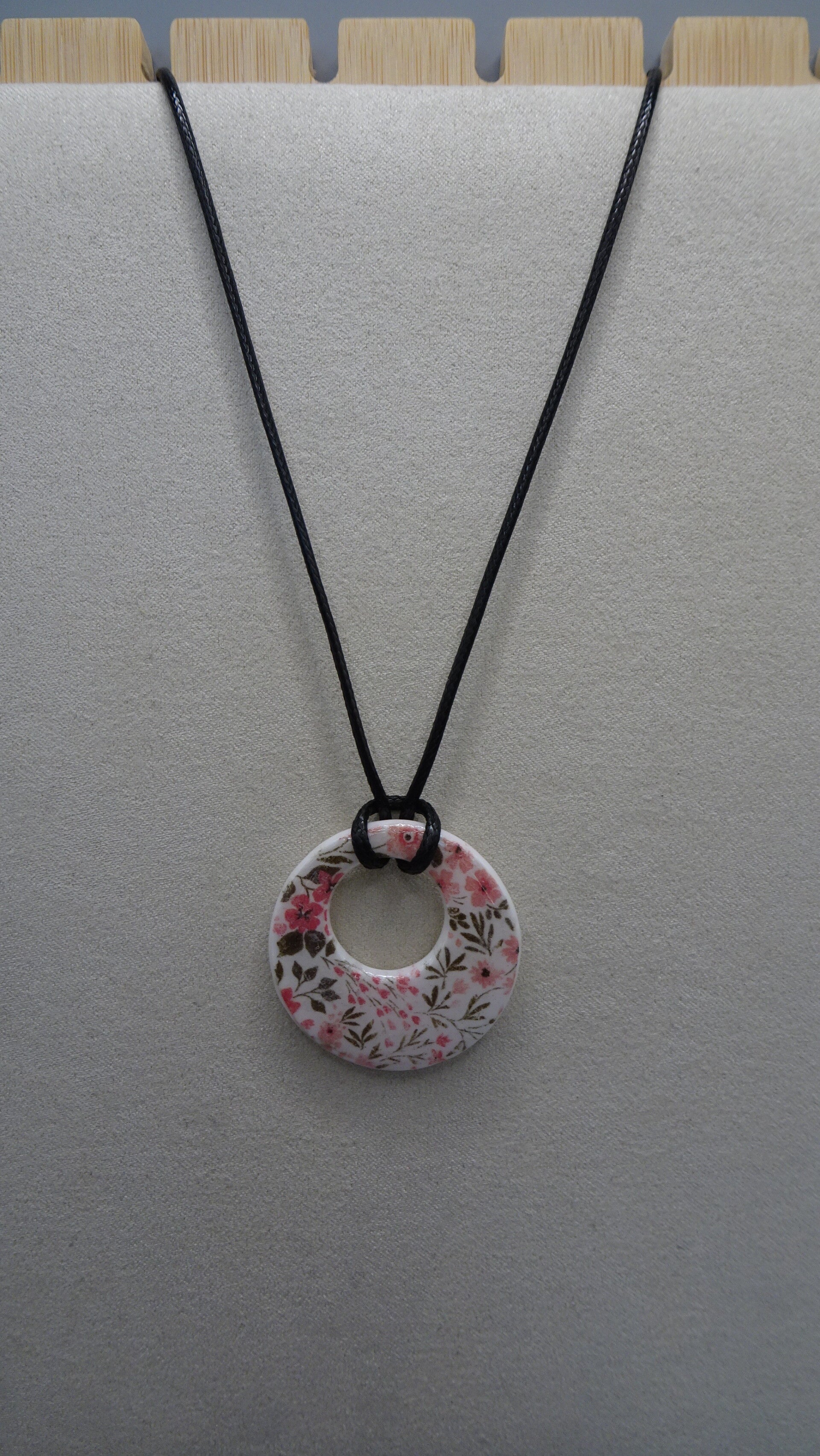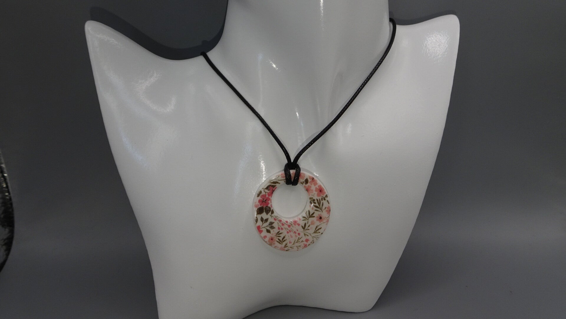 La base du pendentif est blanche sur laquelle est superposé un motif liberty.